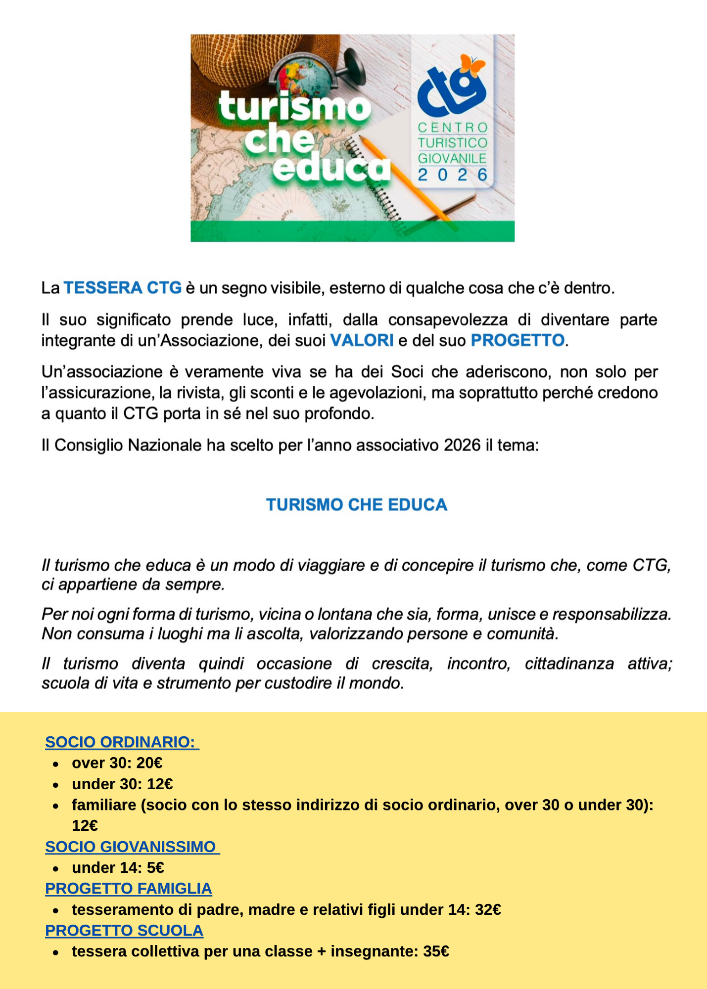 Soci maggiorenni Possono aderire compilando il modulo dedicato e scegliendo la tipologia di socio prevista dal CTG nazionale (under 30, over 30, familiare, ACA, circolo, casa per ferie).
