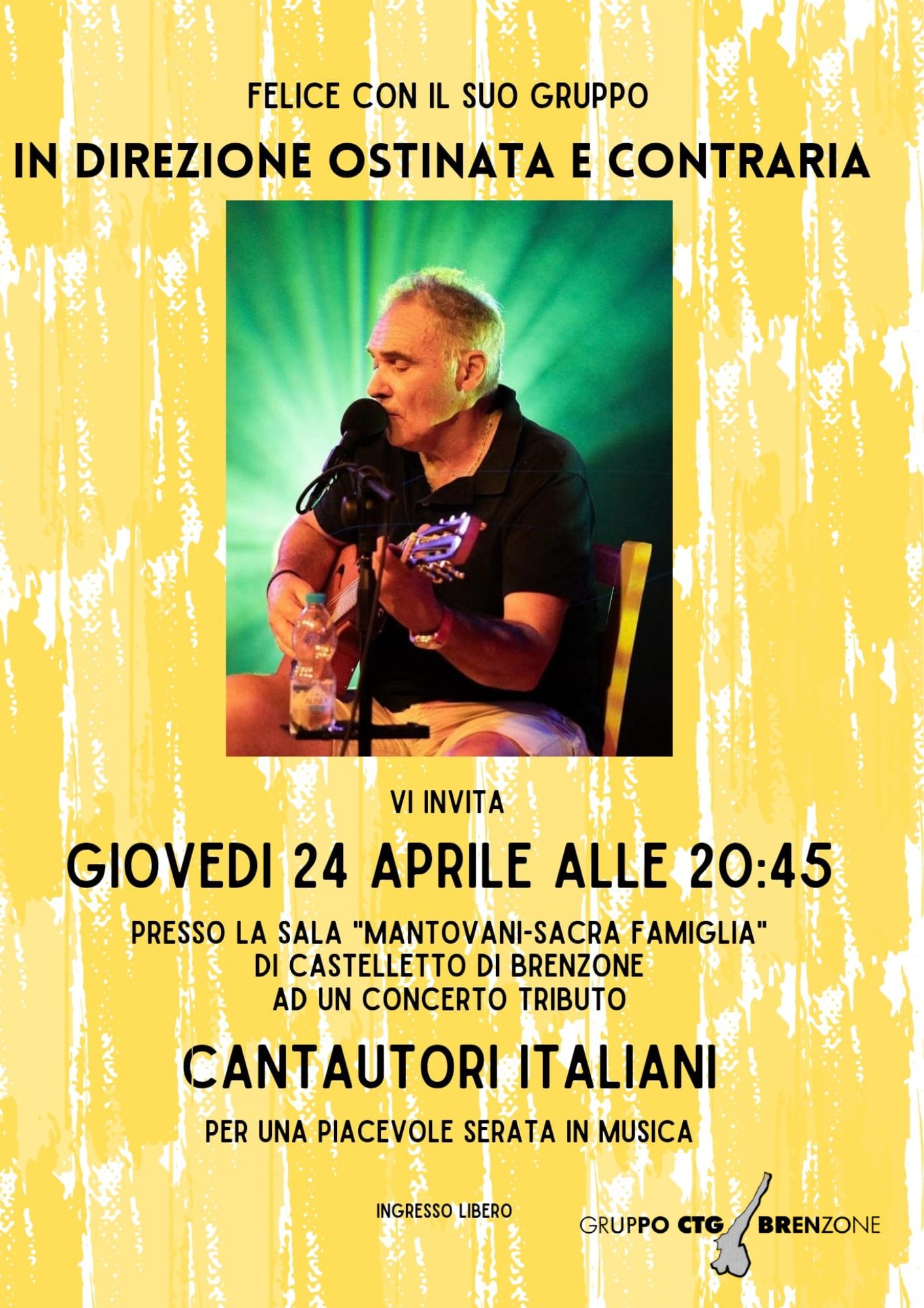 Questa volta ci incontriamo attraverso la musica, in compagnia di un amico caro al CTG e a tutta Brenzone: Felice Consolini. Una serata dedicata ai grandi cantautori italiani, tra note, parole e tanta passione.